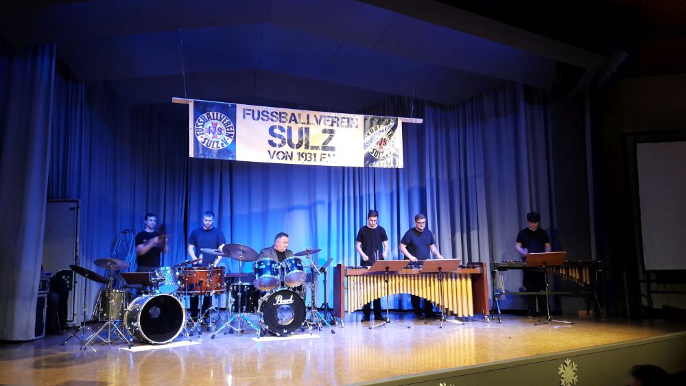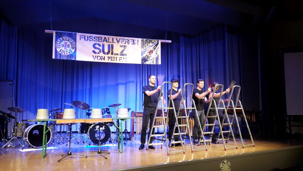 Laut und rhythmisch wurde es mit dem zweiten Programmpunkt des abwechslungsreichen Abends. Charly Lüftner mit seinem Schlagzeug-Ensemble sorgte für Begeisterung bei den Gästen. Ob klassisch mit den Drumsticks oder mit den Händen, ob auf Metallleitern, Blecheimern, mehreren Schlagzeugen oder am Marimbaphon – das Quintett Leon, Manuel, Samuel, Tim und Alexander brachten mit dem teils unorthodoxen Klängen mächtig Stimmung in die Halle.