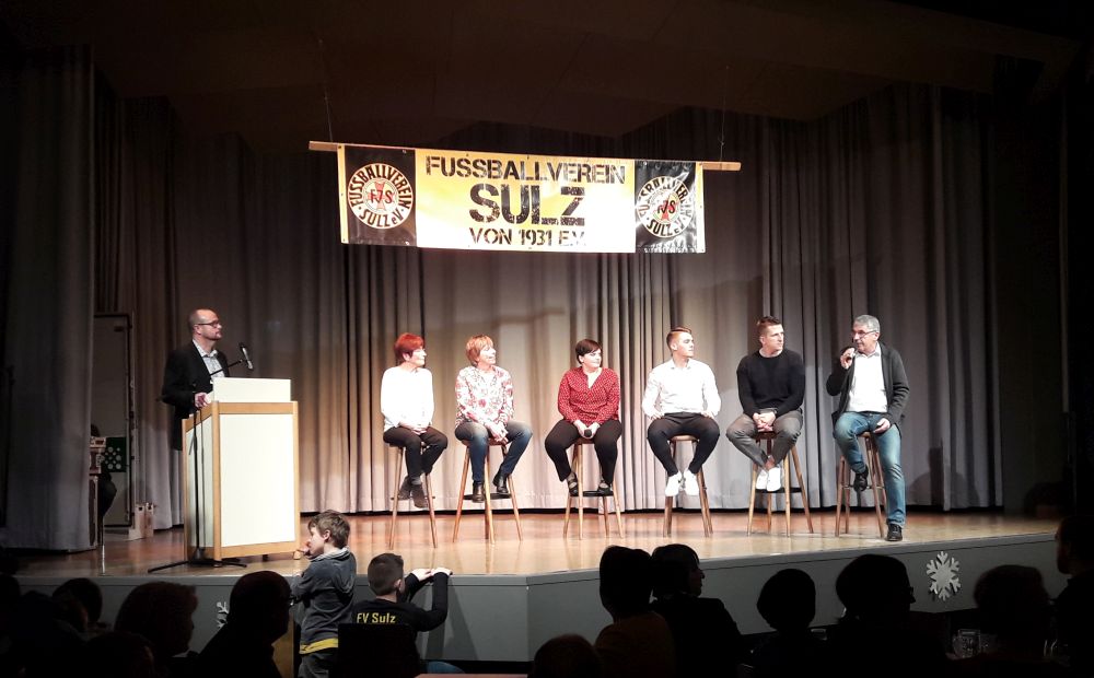 Zum etwas „anderen“ Jahresrückblick bat Klemens Beck danach Sigrid Kopf, Susi Kalt, Nicole Baur, Florian Stuke, Christian Wäldin und Jürgen Binder. Jeweils als Vertreter einer „Abteilung“ gaben die Gäste der Talkrunde eigene Einblicke in die Tennis- und Jugendabteilung, Damen-, Herren- und AH-Mannschaft bzw. die Vorstandschaft. Vielfältige Informationen konnten die Zuschauer aus den Gesprächen erfahren. In Kürze wird der Kunstrasen mit einer LED-Flutlichtanlage ausgerüstet, die C-Mädchen- und Damen feierten zuletzt die Herbstmeisterschaft in ihrer Staffel und hoffen im nächsten Jahr auf eine Ehrung an gleicher Stelle. Das jährlich in den Pfingstferien stattfindende Fußballcamp wurde betrachtet und auch die tolle Anlage des Fußballvereins gelobt. Aber auch die damit einhergehende Arbeit bei Pflege der Anlage und den vielen ehrenamtlichen Stunden die hierbei und bei Festen geleistet werden.